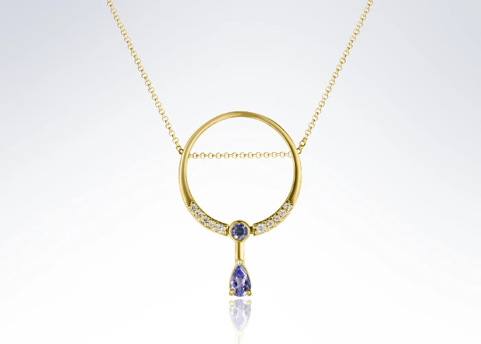 Этот золотой кулон в форме капли, сочетающий яркость и женственность, выделяется редкими танзанитами, расположенными в виде цветочного узора, в обрамлении бриллиантов. Кулон Petal из коллекции Mystic Blue с уникальным танзанитом и холодным сиянием бриллиантов — это украшение, которое невозможно не заметить.